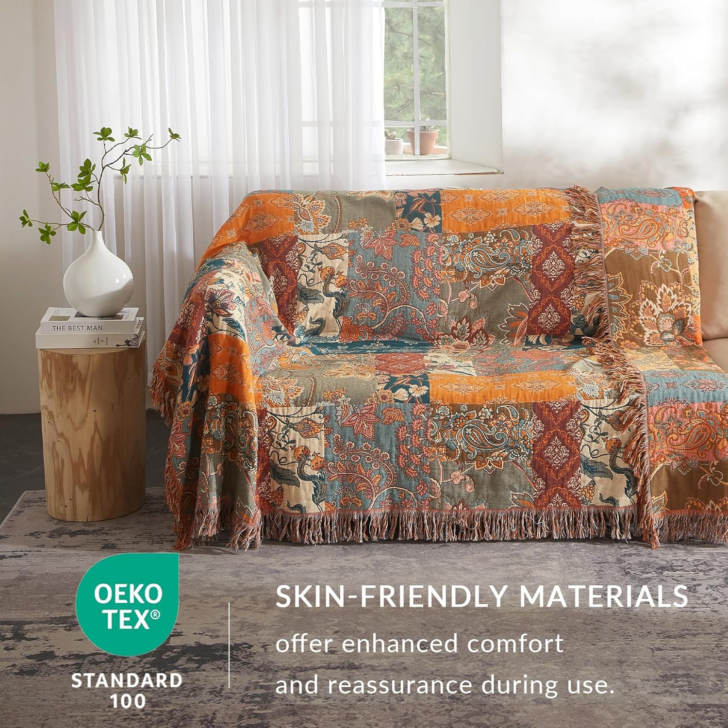 Boho Throw Blanket for Couch Sofa Bed, 100% Cotton Woven Quilt with Tassel 60”x80”, Super Soft Muslin Blanket with Floral Printed, Decorative Reversible Bed Blanket/Cover for All Seasons
