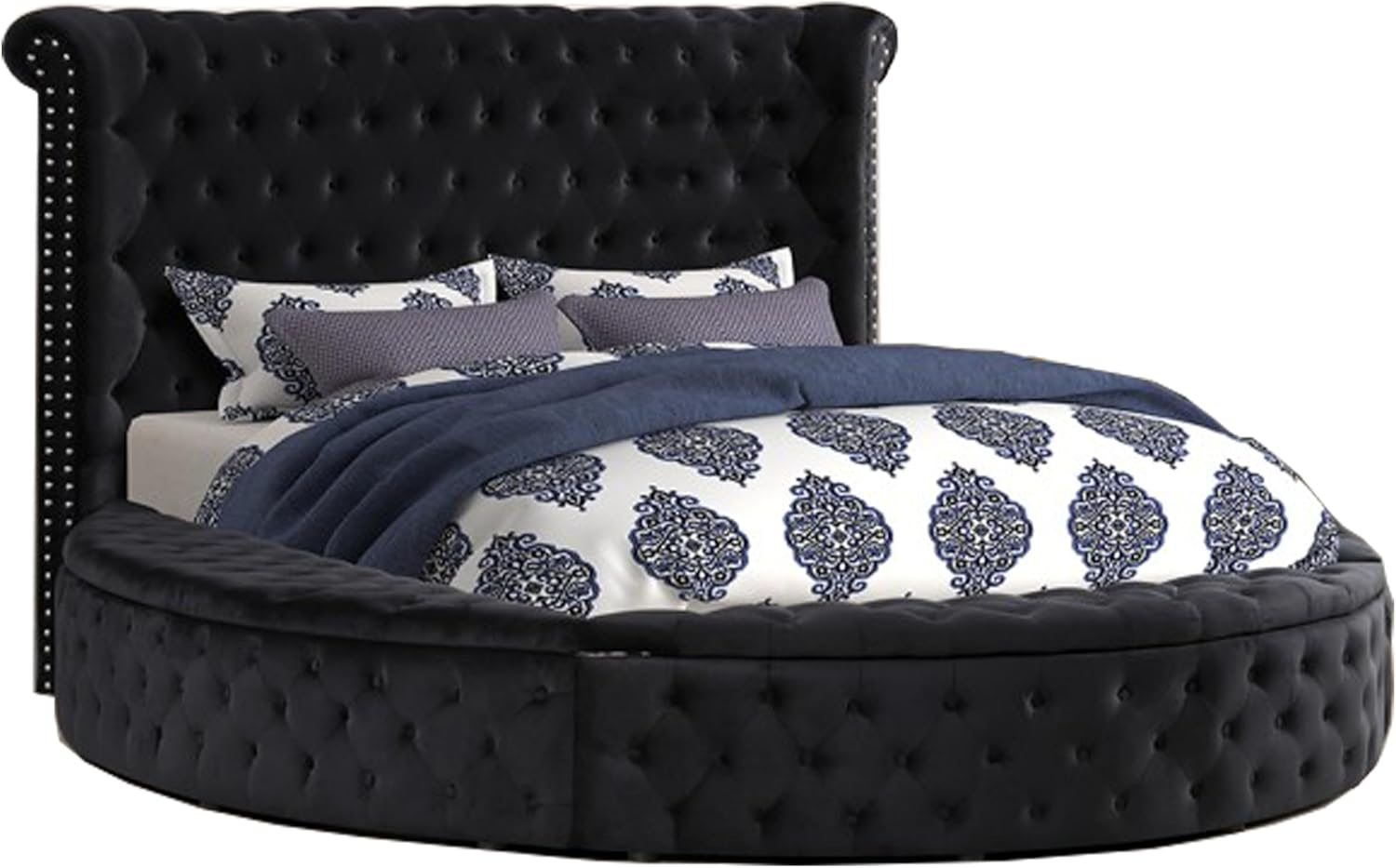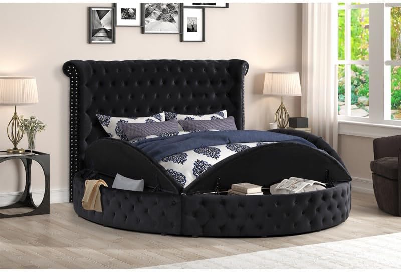 First of a Kind Velvet Tufted Platform Storage Bed, Circle Bed with Button Tufting and Storage Compartments, Queen Size (Black)