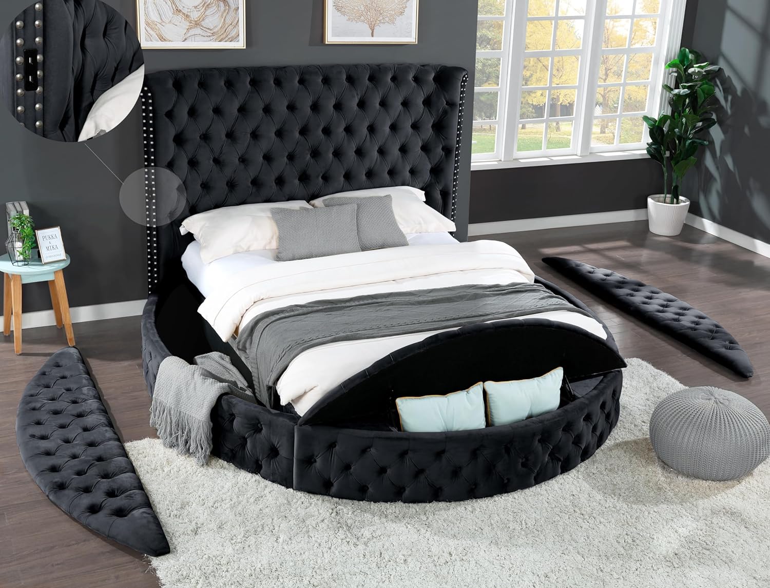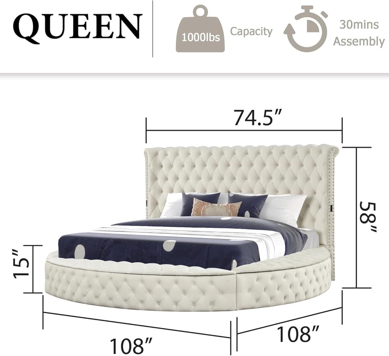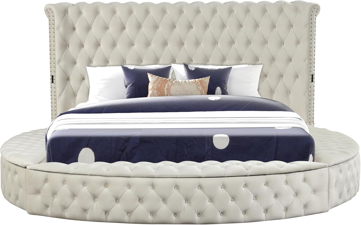 Luxury Round Bed Frame Queen - Velvet Circle Bed with Deep Button Tufting and Footboard Storage Modern Velvet Upholstered Beds with Wingback Headboard Include US- B Chargers and Speakers (Cream)