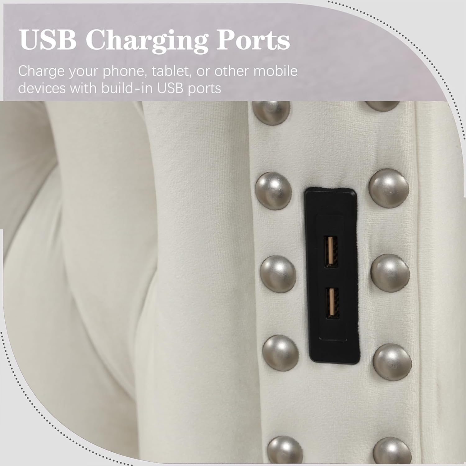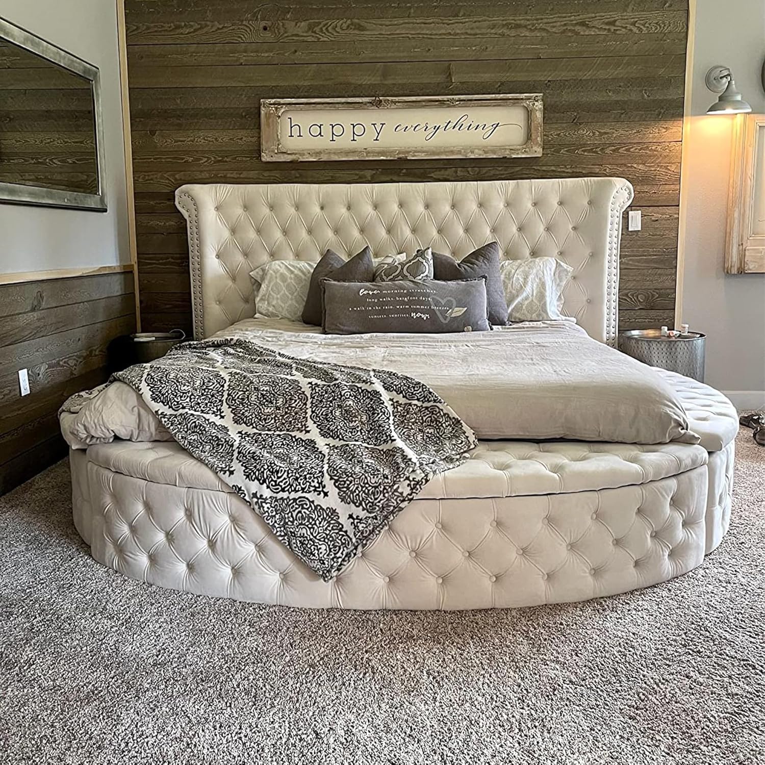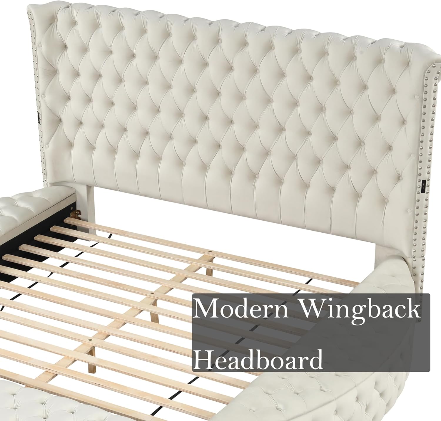 Luxury Round Bed Frame Queen - Velvet Circle Bed with Deep Button Tufting and Footboard Storage Modern Velvet Upholstered Beds with Wingback Headboard Include US- B Chargers and Speakers (Cream)