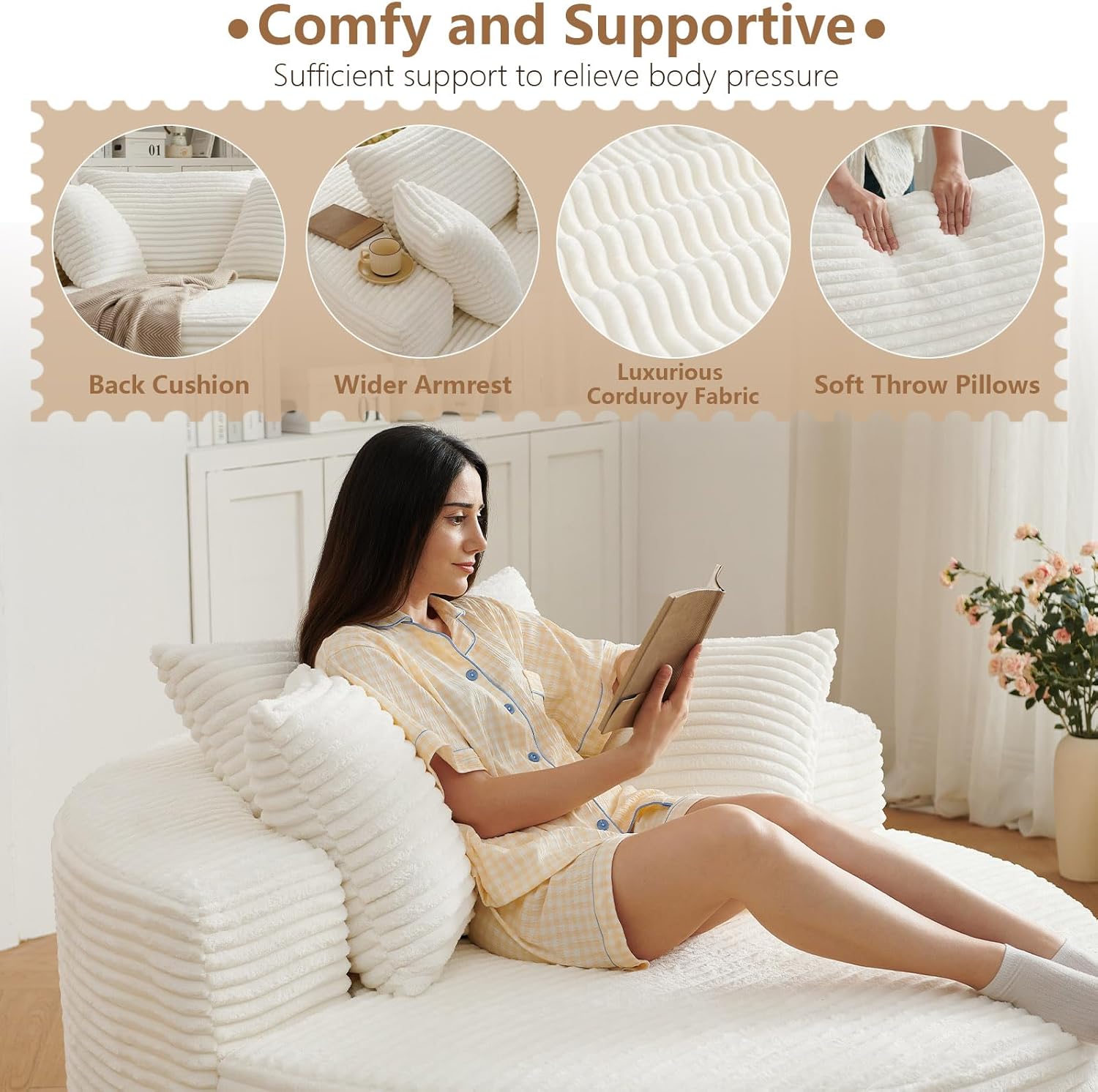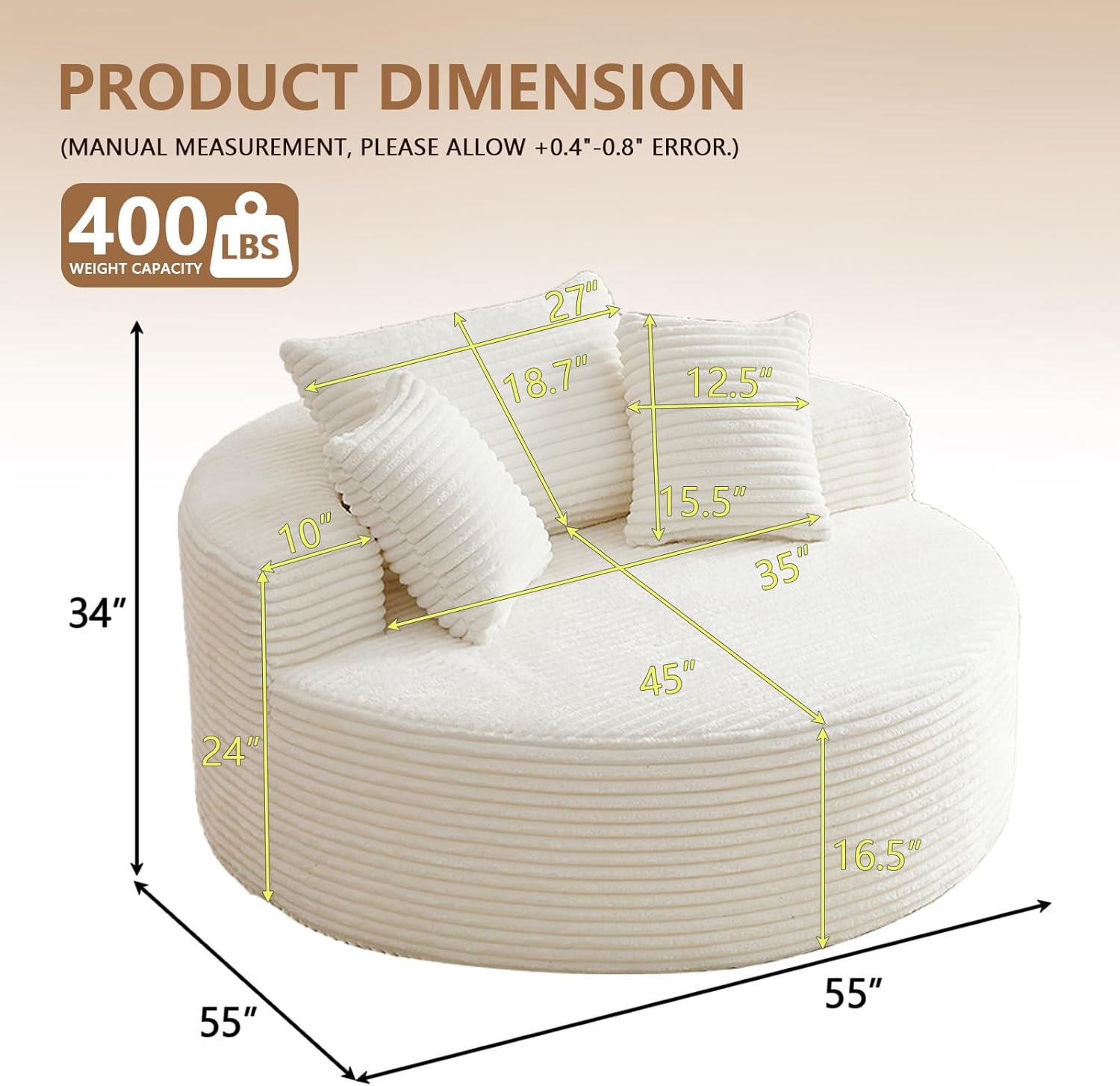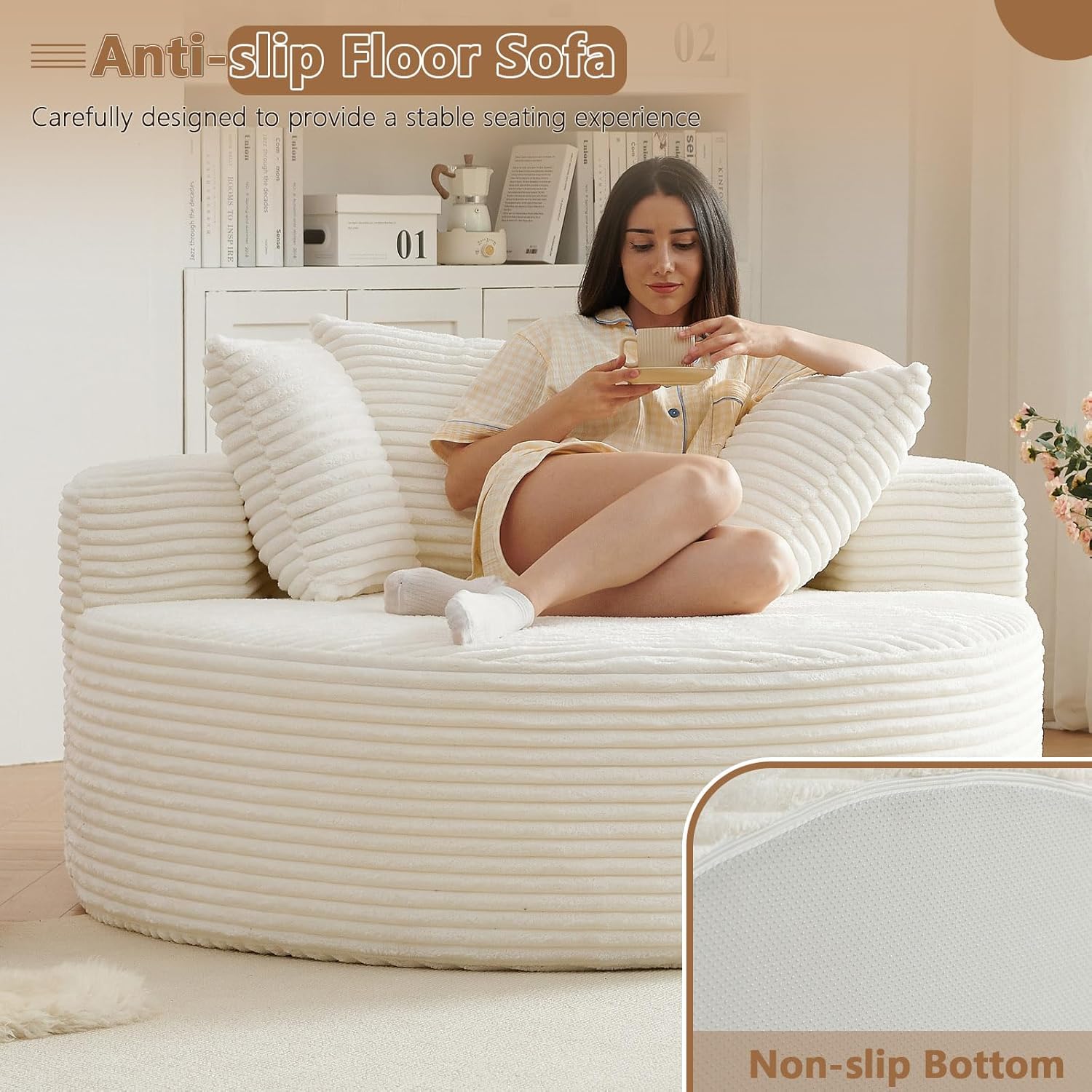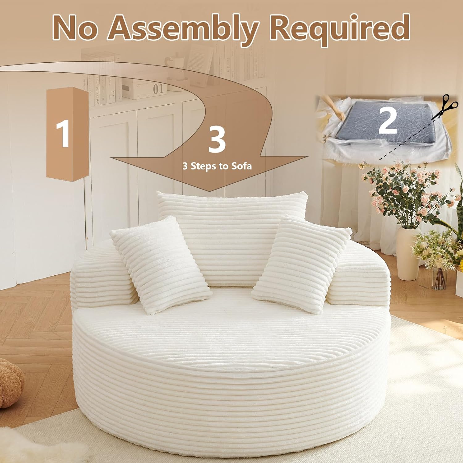Oversized Round Chair Lounge Chaise Indoor, Upholstered Corduroy Deep Seat Cloud Large Circle Sofa Chair, No Assembly Required, Fluffy Modern Sleeper Sofa Bed for Reading, Living Room, Bedroom, White