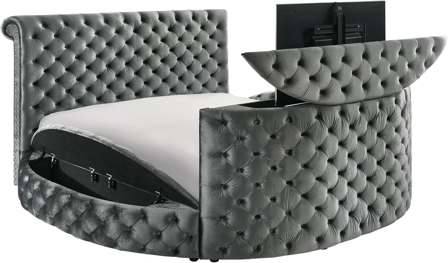 Round Bed Frame with Fireplace and TV Stand - Velvet Circle Bed with Tufted Headboard & Footboard, Upholstered Sleigh Bed King Size, Luxury Bedframe with Side Storage Stools for Bedroom Furniture